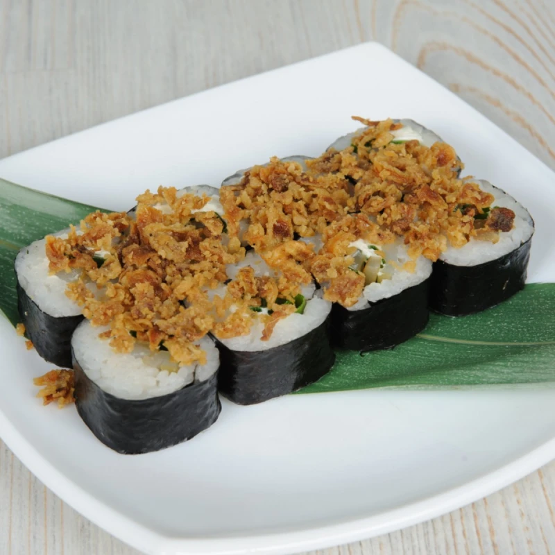нори, рис, сыр кременте, копченый кальмар, жареный лук.