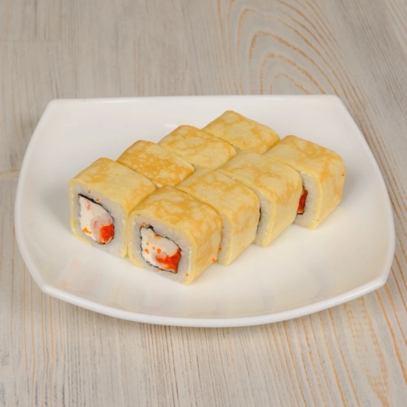 РИС, НОРИ, СЫР КРЕМЕНТЕ, БЕКОН, СНЕЖНЫЙ КРАБ, ТОБИКО, ТАМАГО.