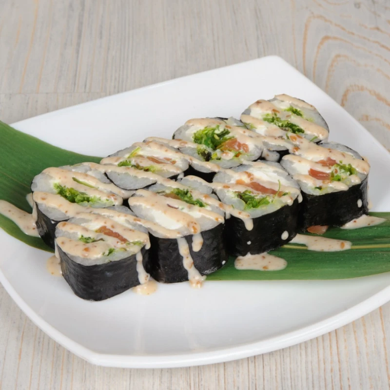 рис, сыр сливочный, копченый лосось, чука, ореховый соус.
