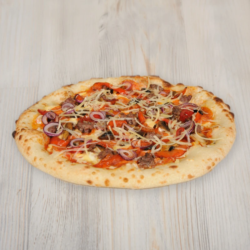 итальянское тесто, соус "Мутти", сыр "Моцарелла", грибы, пепперони, говяжий фарш, болг. перец, лук, сыр "Пармезан".