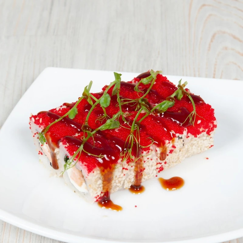 рис, нори, лосось жареный, кунжут , тобико, унаги, микрозелень.